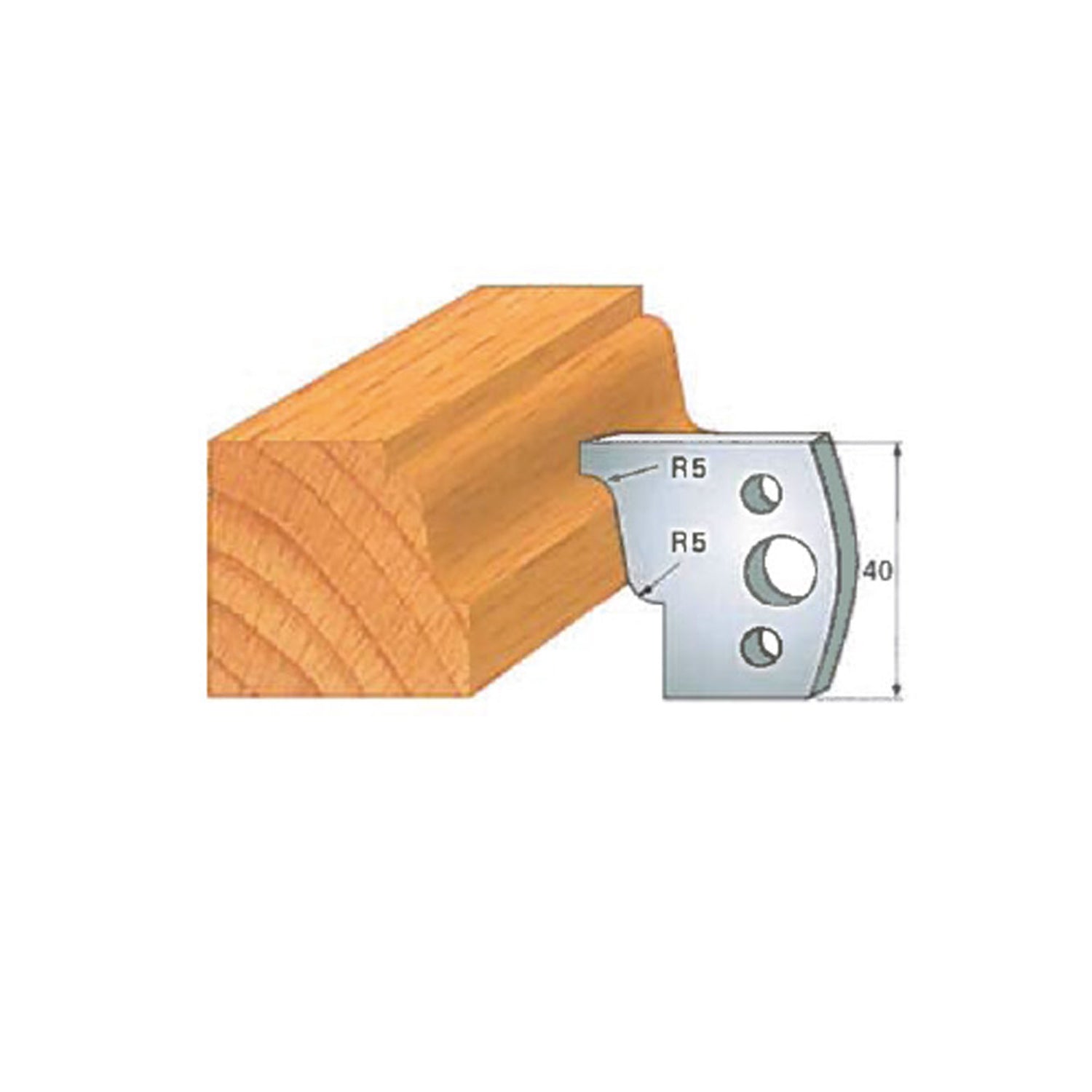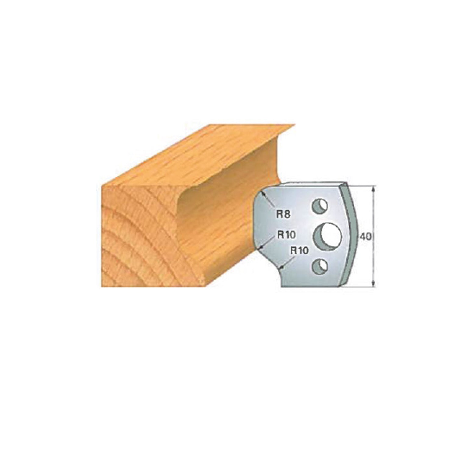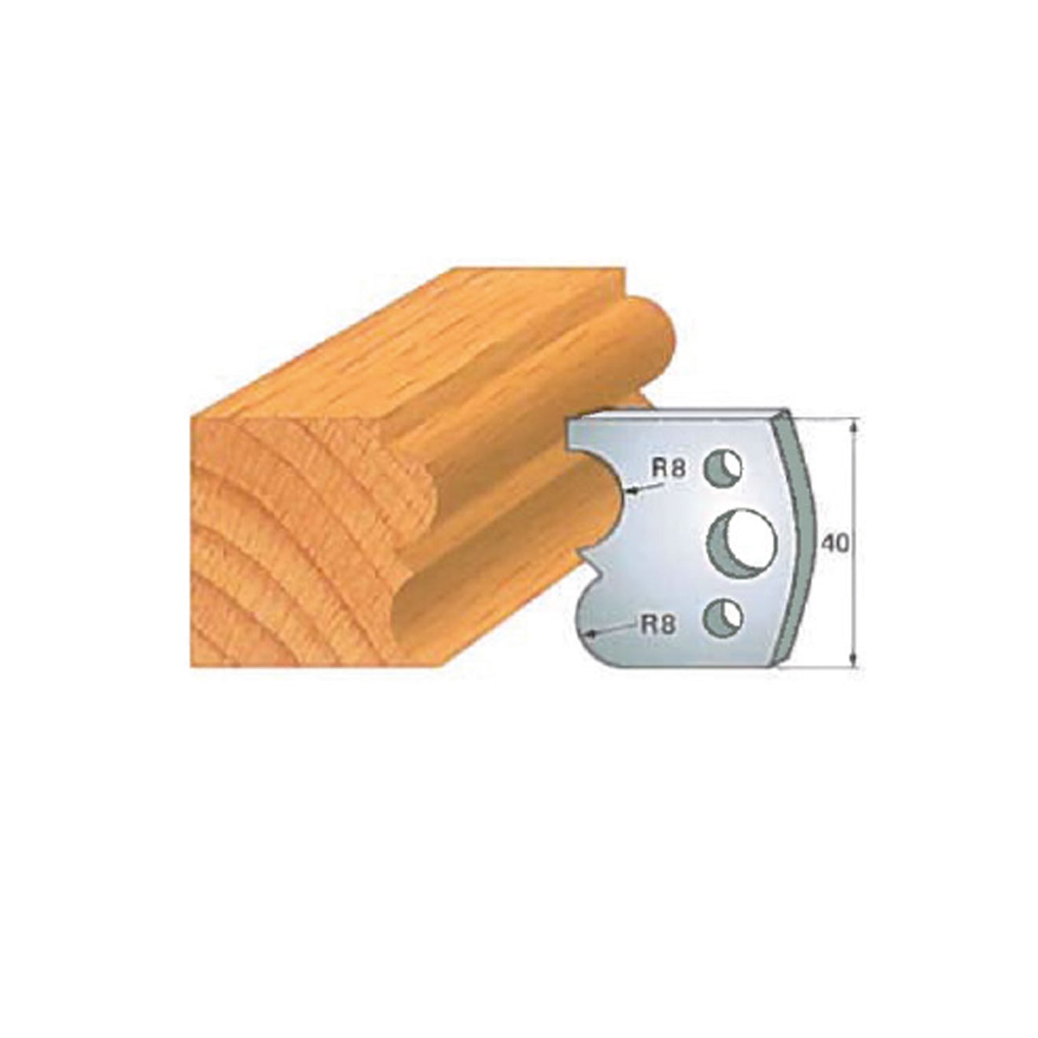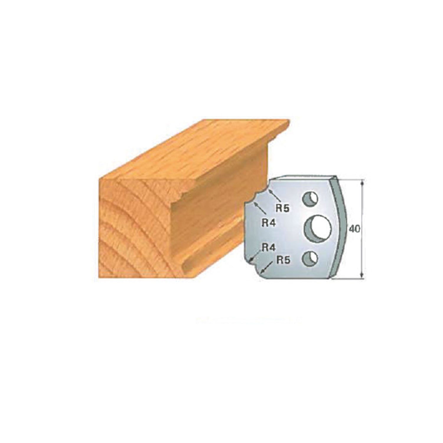 In terms of size, the Insert-Pro shaper head measures 4 inches in diameter and 1-1/2 inches in height, providing excellent balance and stability during operation. The cutting knives are 40 mm tall (approximately 1-9/16"), are 5/32" thick, and vary in width depending on the specific profile, allowing each knife to deliver optimal cutting performance for its intended shape.