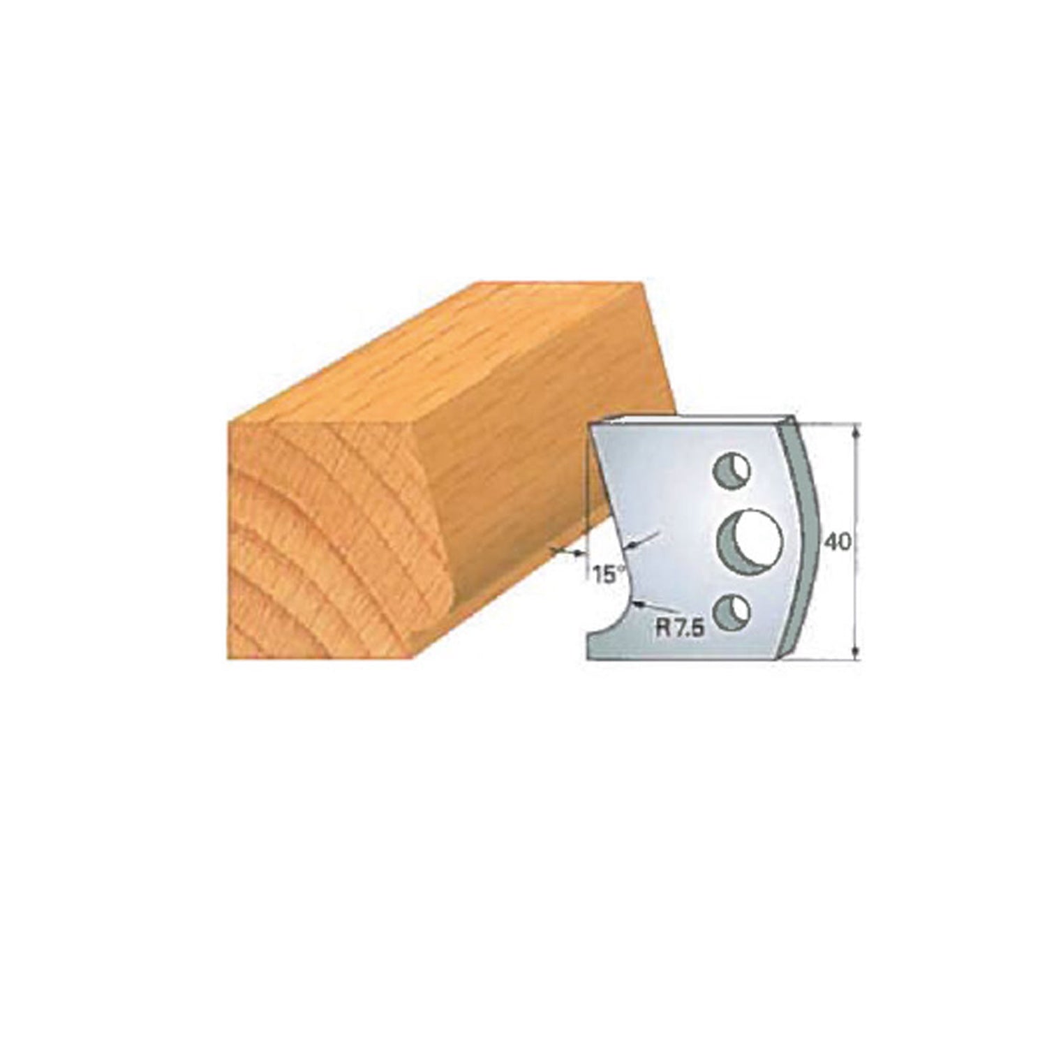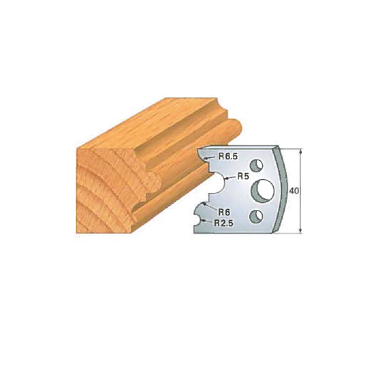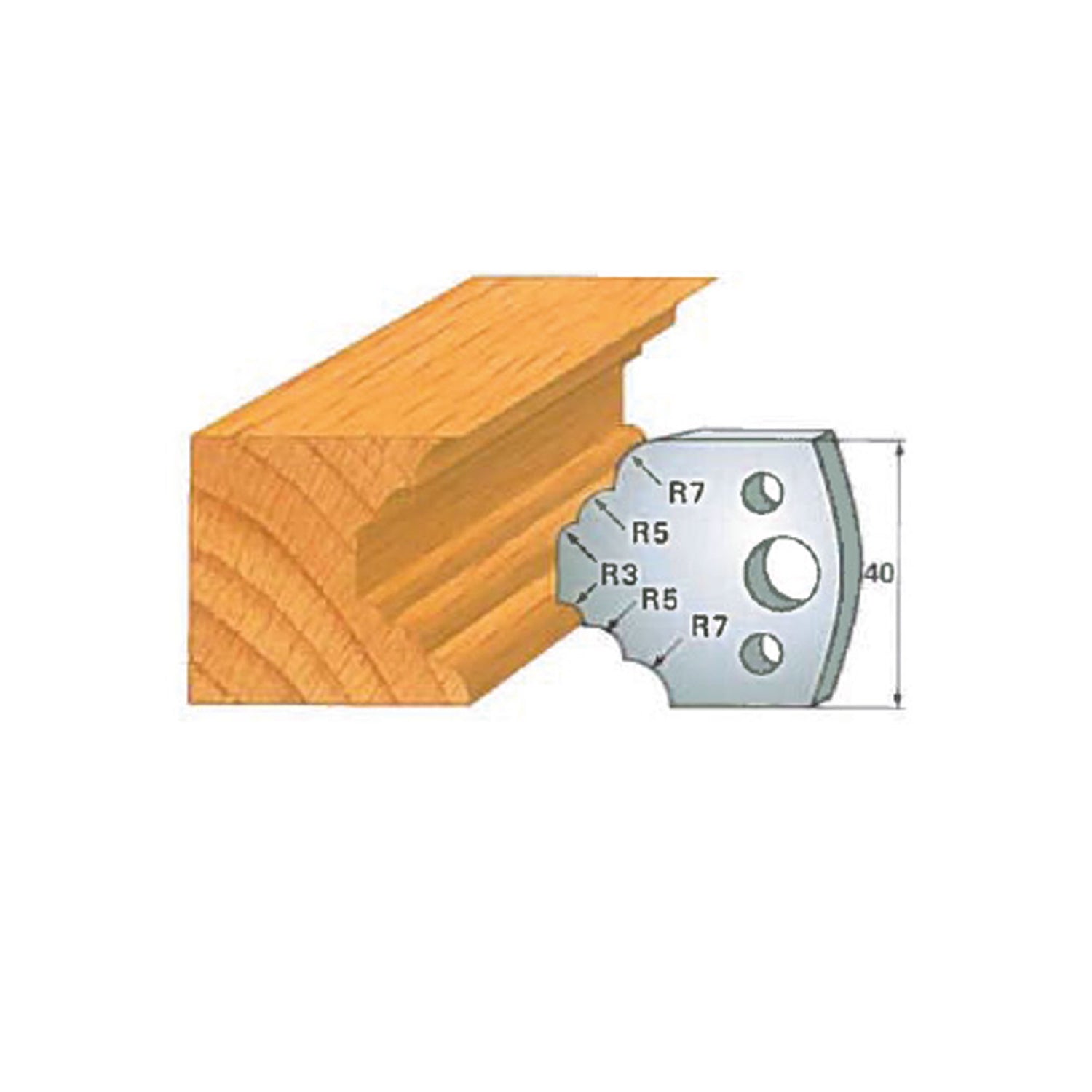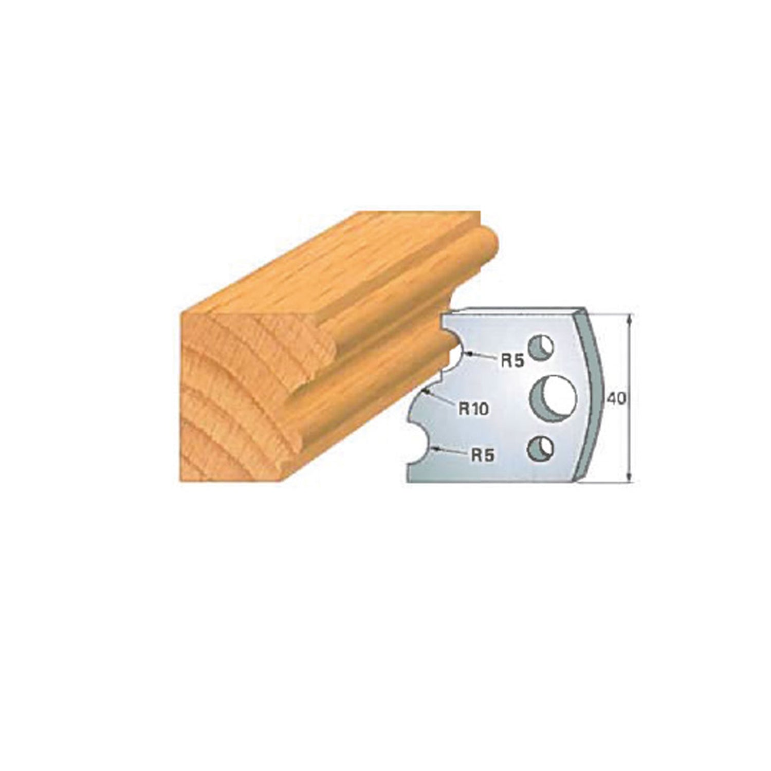 In terms of size, the Insert-Pro shaper head measures 4 inches in diameter and 1-1/2 inches in height, providing excellent balance and stability during operation. The cutting knives are 40 mm tall (approximately 1-9/16"), are 5/32" thick, and vary in width depending on the specific profile, allowing each knife to deliver optimal cutting performance for its intended shape.