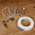 La última pieza de este paquete es un rollo de cinta adhesiva de doble cara de 19 mm de ancho (101-286) . Una buena cinta adhesiva de doble cara permite usar plantillas sin necesidad de tornillos que marquen la superficie de la pieza ni abrazaderas que estorben. Tras probar diversas cintas, descubrimos que esta es prácticamente perfecta. Ni demasiado gruesa ni demasiado fina, crea una unión fuerte sin ser imposible de retirar. Se podría decir que es la mejor opción entre las cintas adhesivas de doble cara.