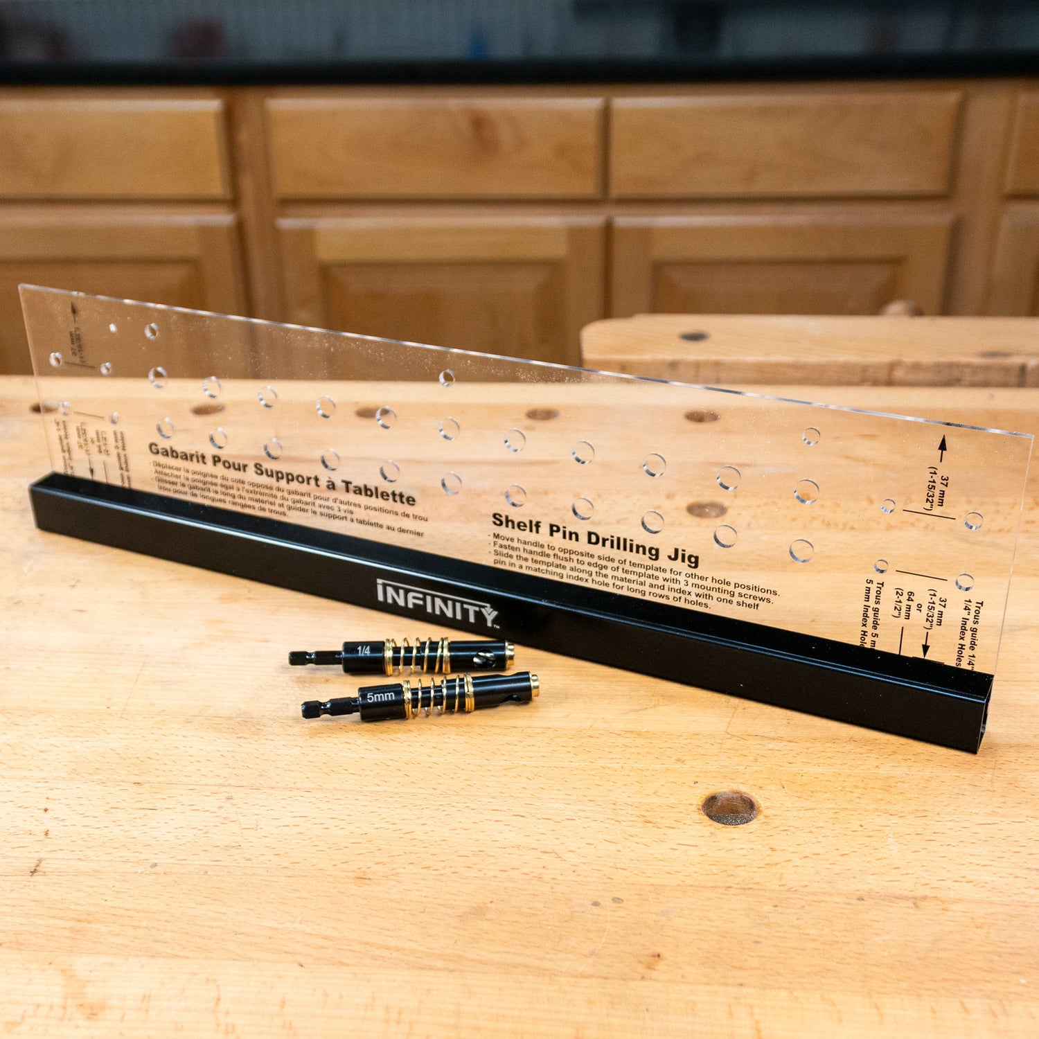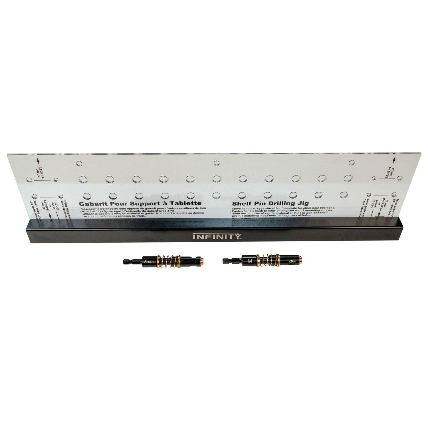 The Infinity Shelf Pin Jig includes both ¼" and 5mm drill bits, each precision-fit to the indexing holes for clean, accurate drilling. Whether you're working with metric or imperial shelf pins, this jig has you covered.