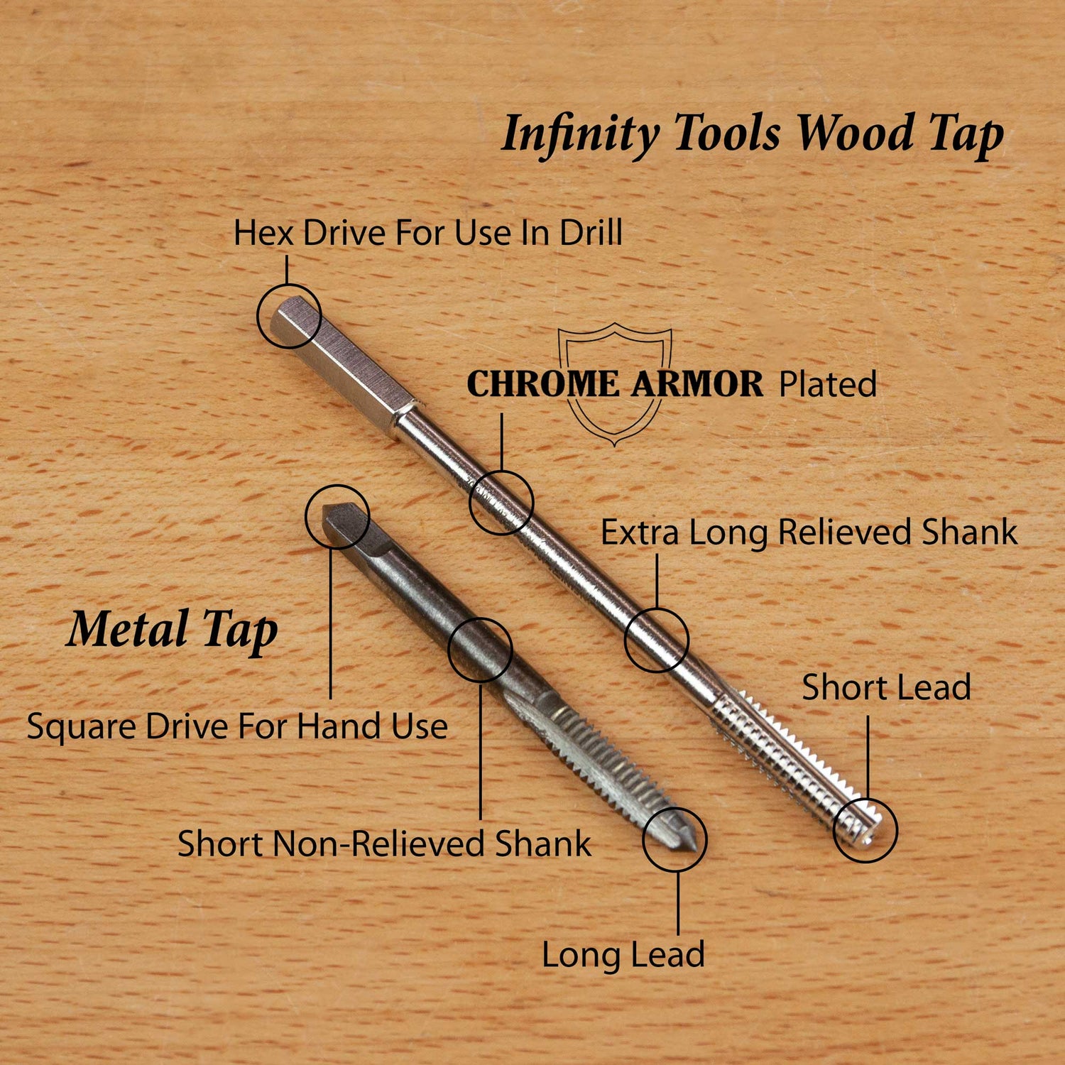 Standard metal taps have a long "lead" specifically for starting in metal. The Infinity Wood Taps have a short "lead" making them better for starting in wood and allows them to cut threads almost all the way to the bottom of a blind hole.